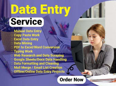 I offer professional data entry services that are fast, efficient, and error-free. With years of experience, I ensure your project is delivered on time and to your satisfaction.