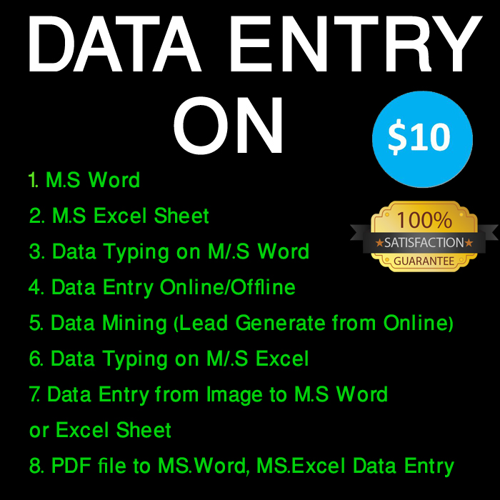 I will do any kind of data entry work in just $10/3 hours. Data Entry services includes all kind of On-Line Data Entry, Offline Data entry work, Data research, Data Analysis, Data Upload on excel/word file, Data upload to your online website, product upload to your any e-commerce website, product image editing(background remove, make white/transparent background, resize images etc.)