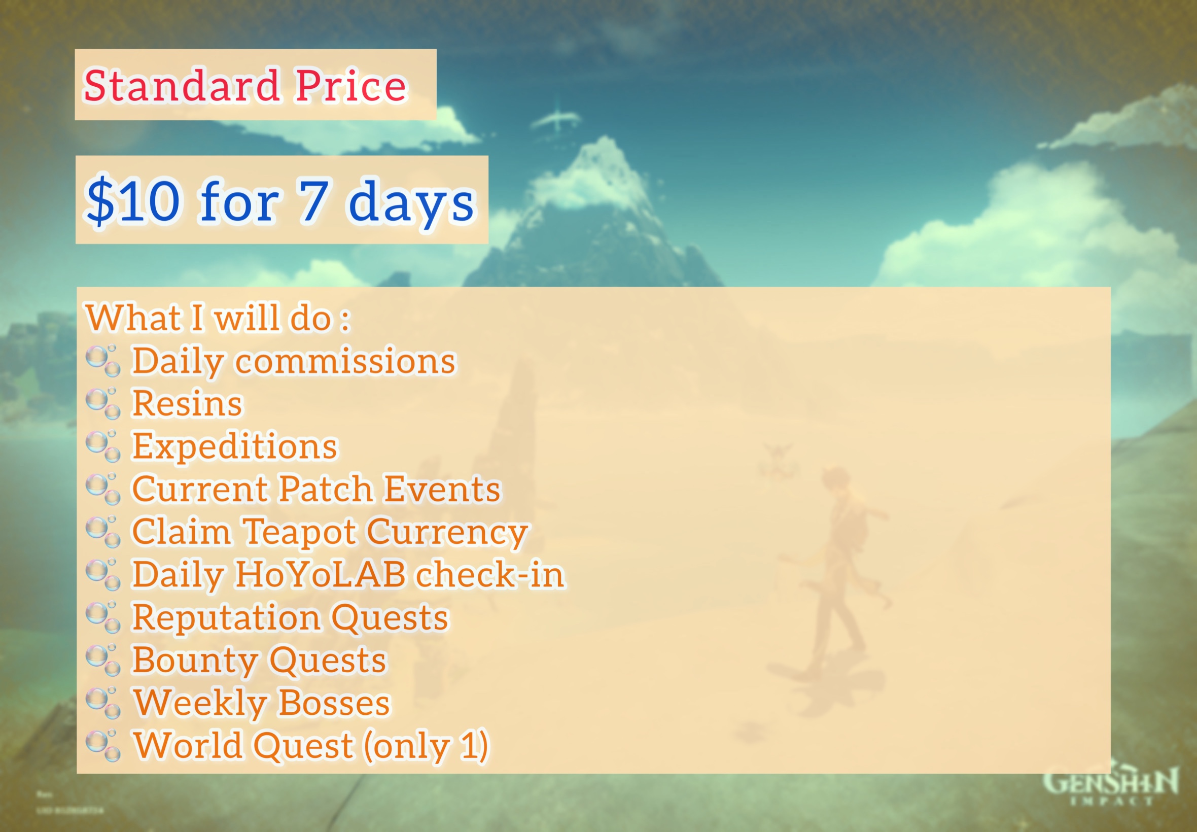 Don’t have time or not enough time to play the game ? Well don’t worry ! I’m Aaron and I offer hospitality services on the game Genshin Impact to travellers who don’t have time because of other life commitments. I will help manage your account and you only do the fun stuffs like gacha pulls ;)