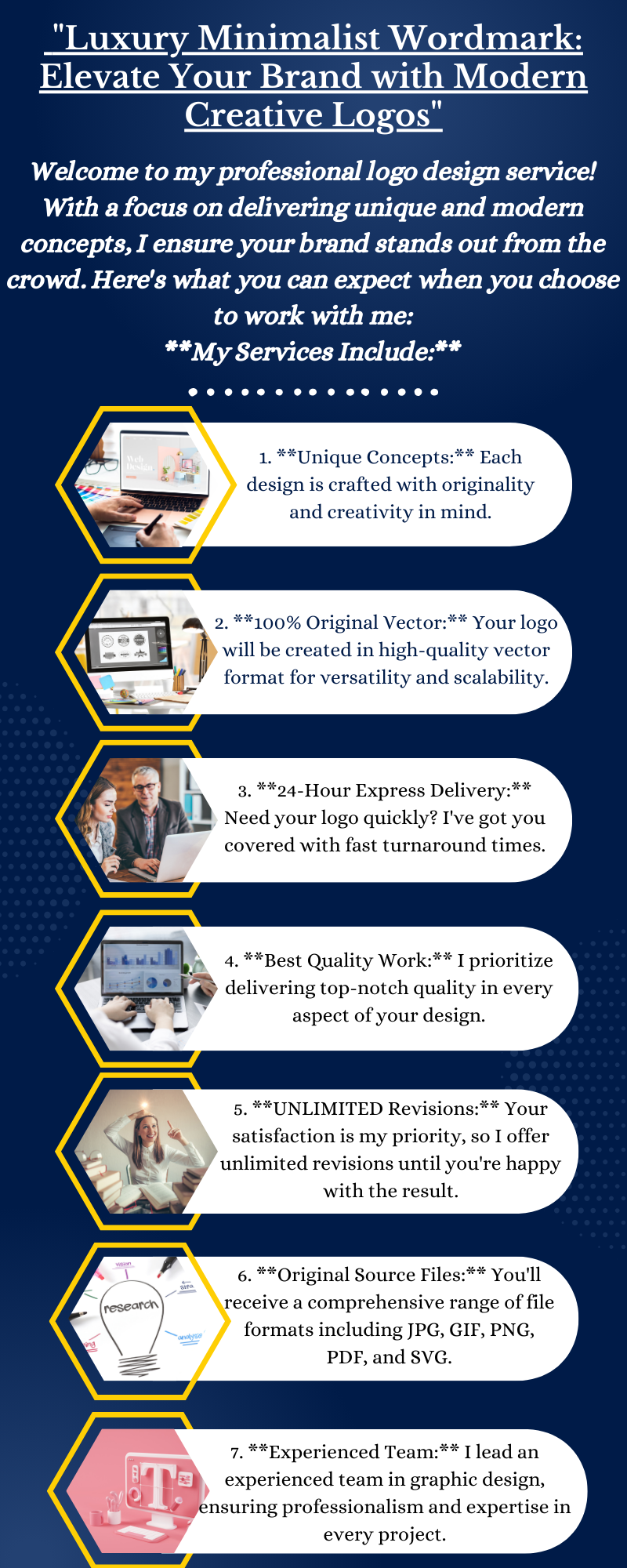 hhj **Why You Should Work With Me:** 1. **Professional and Creative Ideas:** I bring a wealth of professional and creative ideas to the table, tailored specifically to your brand. 2. **100% Unique & Original Designs:** Rest assured, your logo will be completely original, free from stock images or templates. 3. **Full Copyrights:** You'll receive full copyrights for the use of your logo, giving you peace of mind. 4. **Prompt Corrections:** Any minor adjustments or corrections will be swiftly addressed at any stage of the design process. 5. **High-Resolution File Delivery:** Your final logo will be delivered in high-resolution files for optimal quality. 6. **Perfect Customer Service:** I pride myself on delivering excellent customer service, ensuring a smooth and enjoyable experience. 7. **Money-Back Guarantee:** If for any reason you're not satisfied, I offer a 100% money-back guarantee. 8. **Unlimited Revisions:** Your satisfaction is paramount, and I'll work tirelessly to ensure your logo exceeds your expectations. Contact me today to bring your brand to life with a luxury, modern, and unique logo design! Let's collaborate and create something remarkable together.