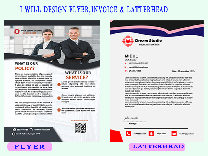 Whether you need promotional flyers business invoices or official letterheads I provide designs that are modern functional and fully customized Each design is carefully crafted to meet your requirements