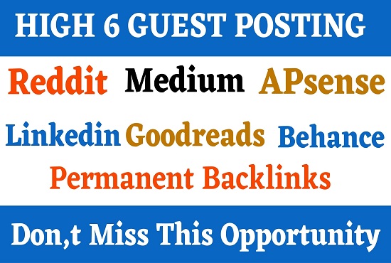 I will write 6x400+ unique articles and publish the guest post on high DA90+ Medium, Reddit, Apsense, Linkedin, Goodreads with Permanent backlinks. Authority backlink to increase the traffic as well as google rankings.