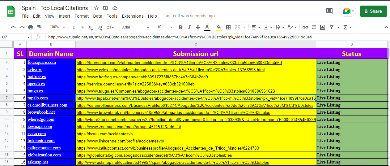 I will do 50 LIVE Spain authority Local Citation web directory for local SEO