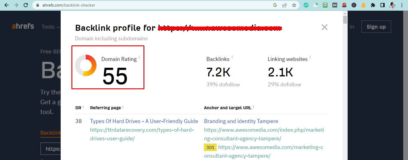 Ans: Domain Rating is a proprietary Ahrefs metric that shows the strength of a target website's total backlink profile (in terms of its size and quality). DR is measured on a logarithmic scale from 0 to 100, with the latter being the strongest.