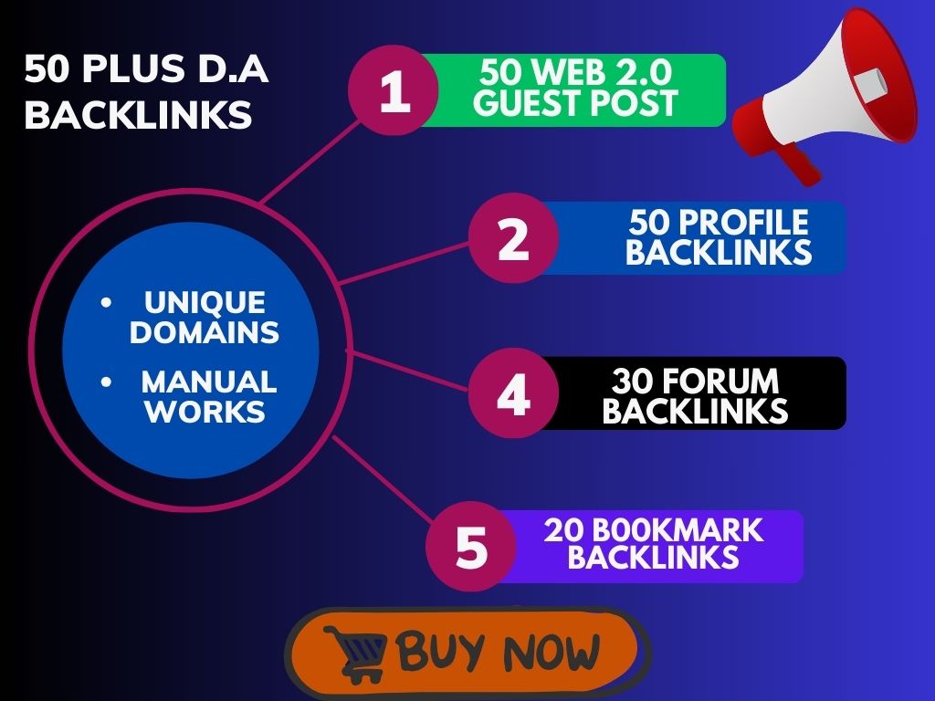 - ℹ️ With my comprehensive gig, you'll receive a powerful combination of 50 web 2.0 guest posts, 50 forum links, 50 profile links, and 50 bookmark links with 50 Plus D.A . This diverse mix of links will supercharge your efforts and propel your website to new heights on search engine results pages.
