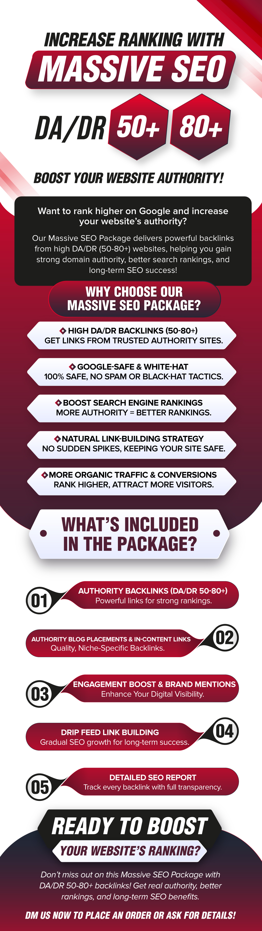 To improve your website ranking, a comprehensive SEO strategy combined with high-quality link-building is essential. Here's how a Massive SEO Package with Domain Authority (DA) 50 to 80 backlinks and link-building tactics can help: