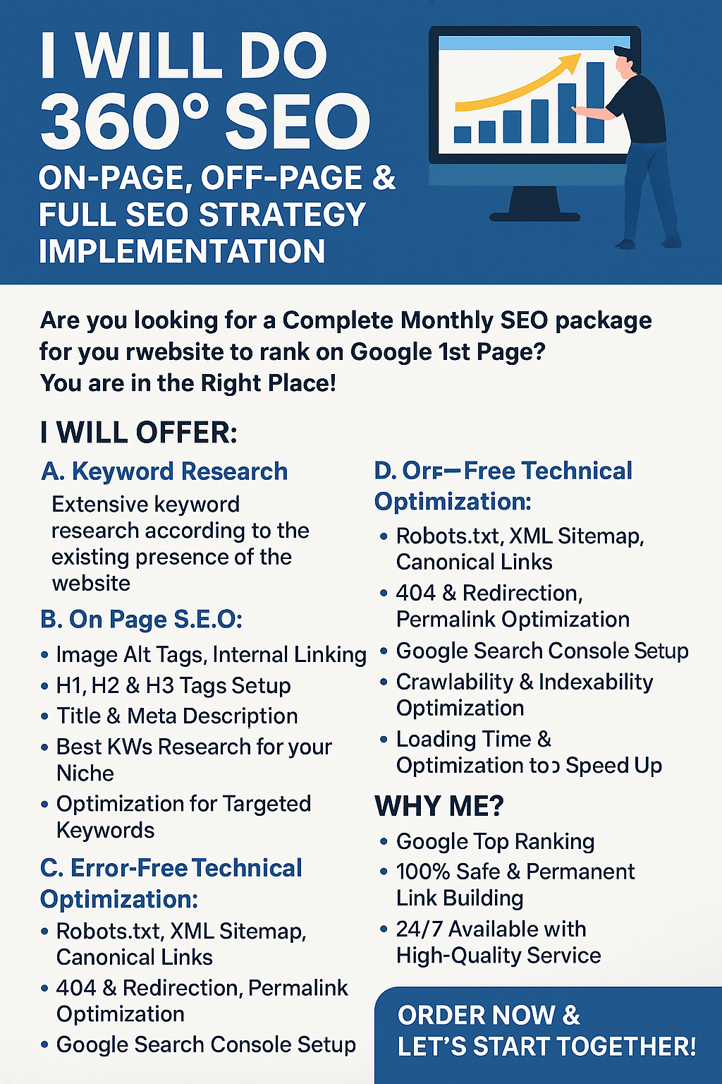 As an SEO Specialist, I have a premium strategy for complete SEO service to supercharge your website rankings. My package includes keyword research, on page, off page SEO (link building/backlinks) which are the most important things for better Google top rankings.