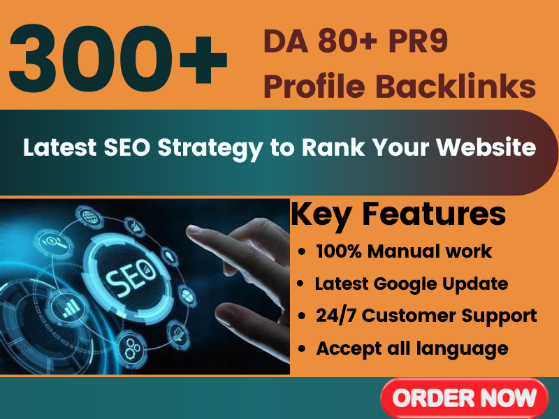 I will create 300+high-qualityprofile backlinks on high PR5 or high Domain Authority (DA) websites, with mostsites having a DA of 80 or higher.