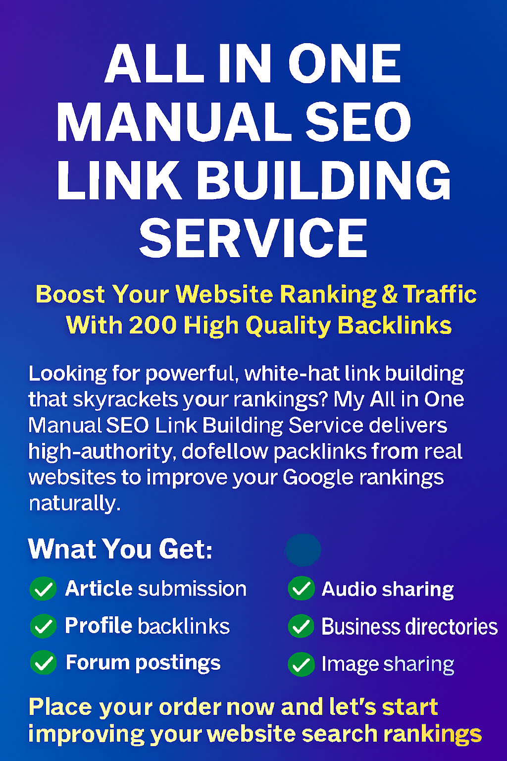 All In One Manual SEO Link Building ServiceBoost your website’s visibility and traffic with 200 high-quality backlinks built manually for long-term SEO success.Looking for powerful, white-hat link building that skyrockets your rankings? This service delivers high-authority, dofollow backlinks from real websites—no automation, no spam. Every link is manually created to ensure safety and effectiveness.