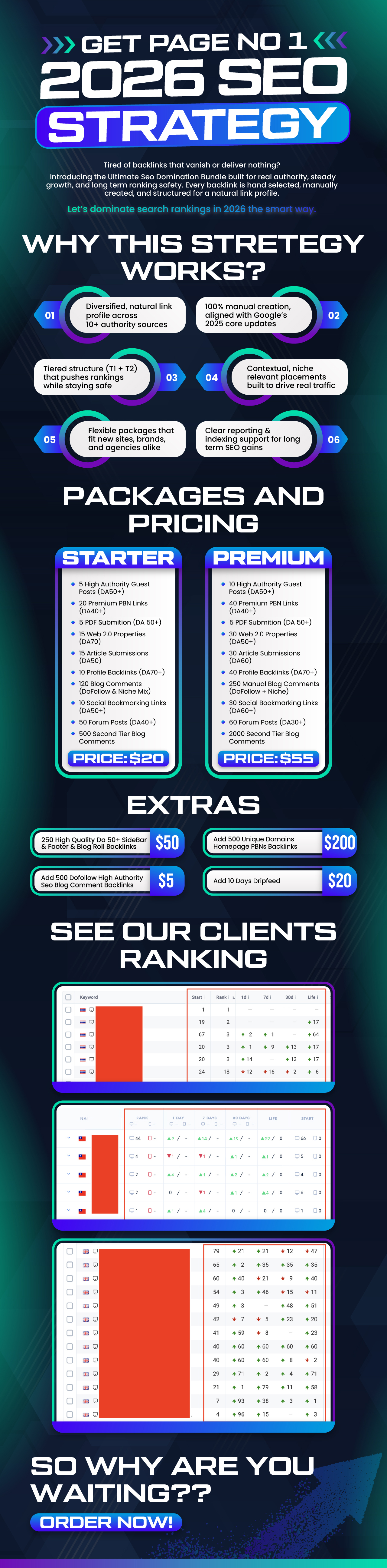 6. Can I customize my order with "Extras"? Yes! You can choose either the Starter ($30) or Premium ($85) package and add any of our "Extras" (like the 500 Unique Domain Homepage PBNs) to create a custom strategy that fits your budget and goals.