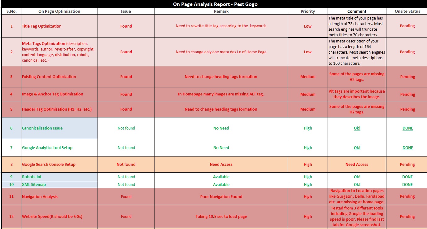 I will provide you SEO Audit report with every possible On-Page SEO stuff with keyword research and ranking status. I will provide you the following in basic: