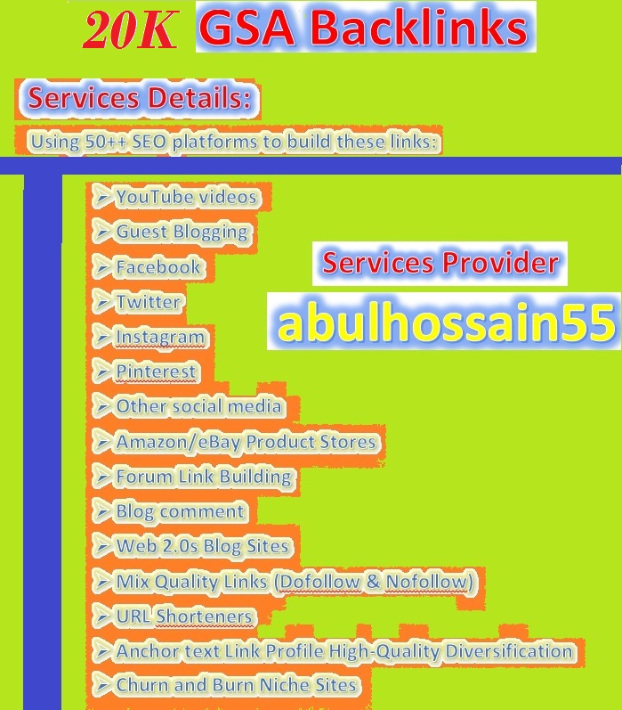Create & Provide 20k+ GSA UNIQUE BACKLINKS for Your Website ranking for $27 is ranked 5 out of 5. Based on 3 user reviews.