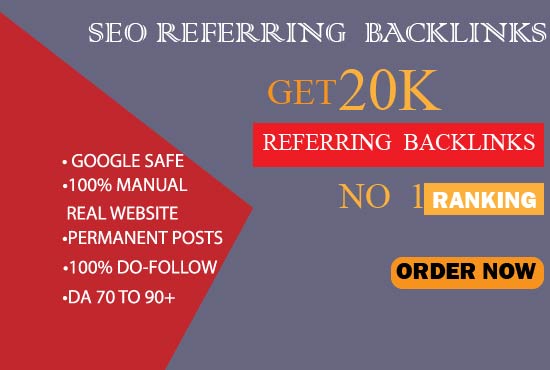 Increase Referring Backlinks to Increase Google Ranking.Referring Backlinks are The Backlinks That Come From A Unique Domain.Get super fast increase in your backlinks that will impact fast on your domain to rank in google. These links increase your presence. These links increase your presence, boost authority, rank domain high brand.I Will build your website referring domains and SEO Backlinks for your website ranking. All the backlinks will come from Unique Referring domains, will be 100% dofollow and Permanent.How This Gig is Helpful?*High DR Site From 10 to 50*All Do-Follow Links*All Backlinks are Unique Domain*100% Safe From Any Update*100% Permanent Links*100% Indexing Links*Full Report From Excel WorksheetWhat Type Of Backlinks Are these?
