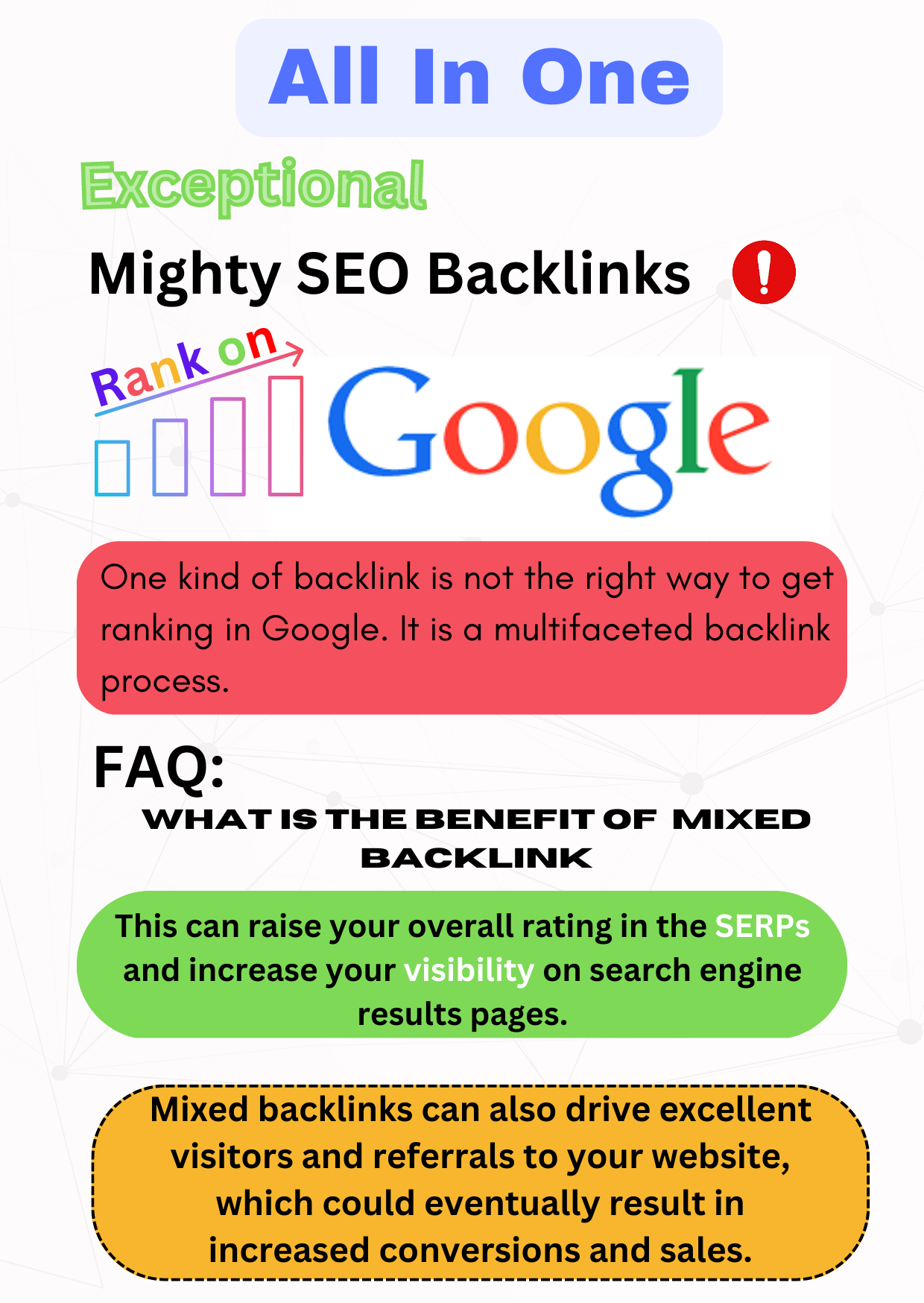 Mixed backlinks are an excellent approach to improve your website's SEO rankings. You can create a more diverse backlink profile that helps search engines determine SERPs Mixed backlinks can also drive excellent visitors and referrals to your website, which could eventually result in increased conversions and sales.