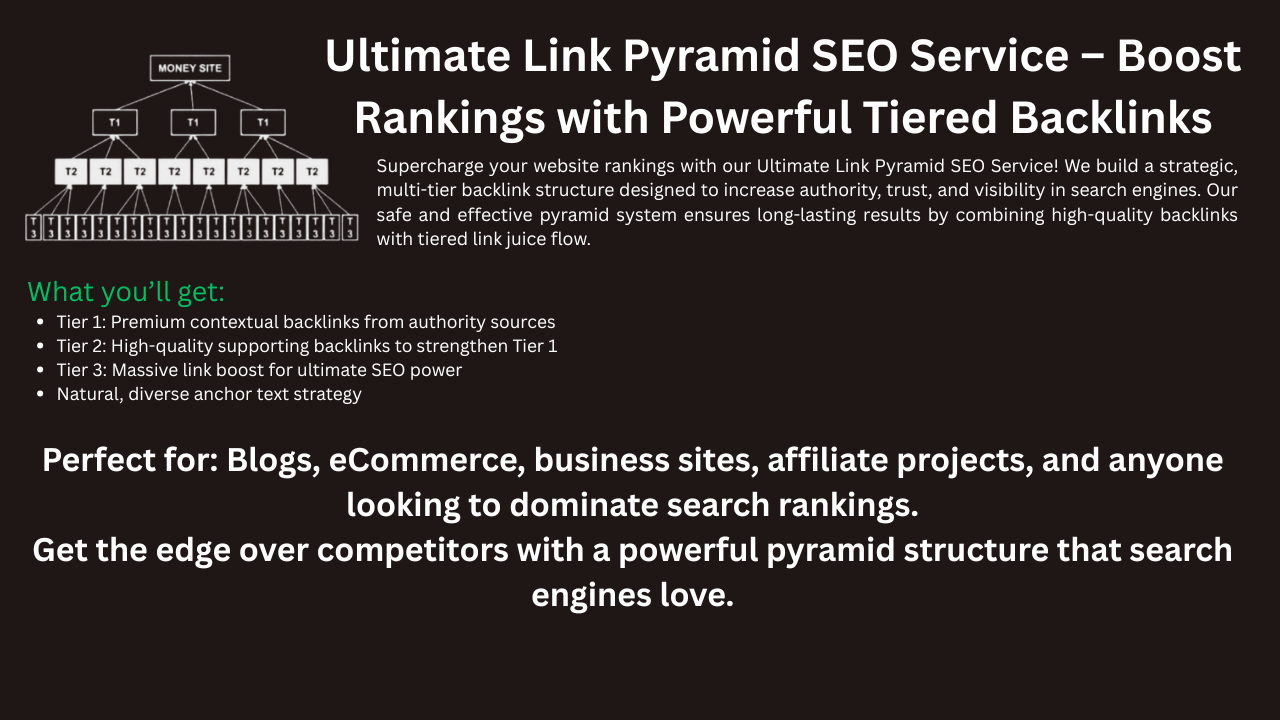 Supercharge your website rankings with our Ultimate Link Pyramid SEO Service! We build a strategic, multi-tier backlink structure designed to increase authority, trust, and visibility in search engines. Our safe and effective pyramid system ensures long-lasting results by combining high-quality backlinks with tiered link juice flow.