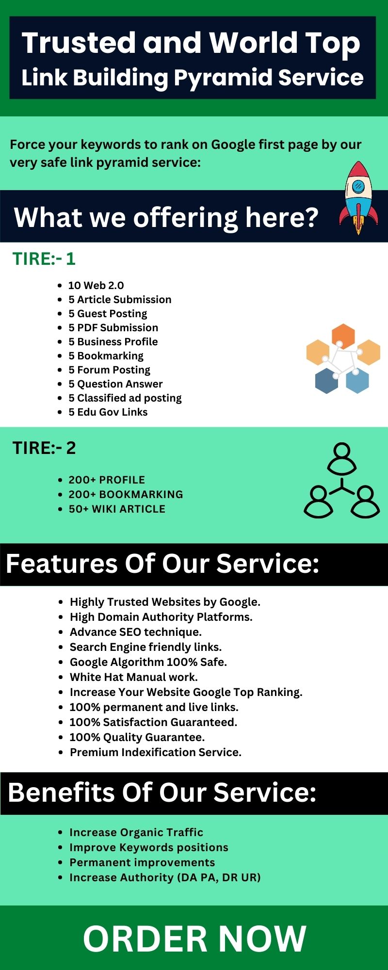 Link pyramids are the useful link building strategy that involves building backlinks and then sending backlinks to those backlinks. We would boost your rankings with our TRUSTED AND WORLD TOP LINK BUILDING SEO SERVICE. Our TRUSTED AND WORLD TOP LINK BUILDING SEO SERVICE is a Most powerful service that is coveted by firms and experts all over the world. Link Pyramid is one of the actual SEO methods that is used for ranking websites in the SERPs of Google. This kind of Pyramid will get you greater results and more traffic.