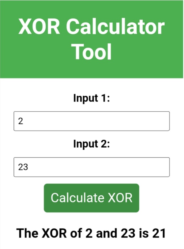 A XOR calculator is a computer program or a circuit that performs the logical operation known as XOR (exclusive OR) on two binary inputs and produces a binary output. The XOR operation returns 1 (or "true") if the inputs are different, and 0 (or "false") if the inputs are the same. The XOR operation is often used in digital logic and computer science for tasks such as error detection and correction, cryptography, and data transmission.