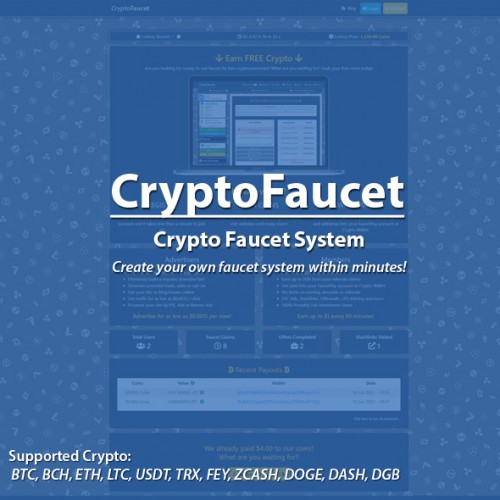 CryptoFaucet is a new type of multi-crypto faucet which brings plenty of different features togheter into a complete system. This system was designed to be attractive and easy to use. With plenty of different features this system was designed to bring revenue and promote itself in a short time. Some of main features of this system are listed bellow, but to see this system working, we invite you to check the demo from the bottom of this page. One of the most important parts of this script is that, even if is a faucet and it does proccess withdrawals in crypto, user is rewarded in-site with coins which are calculated on USD, keeping you safe from losing money because of crypto prices volatility.