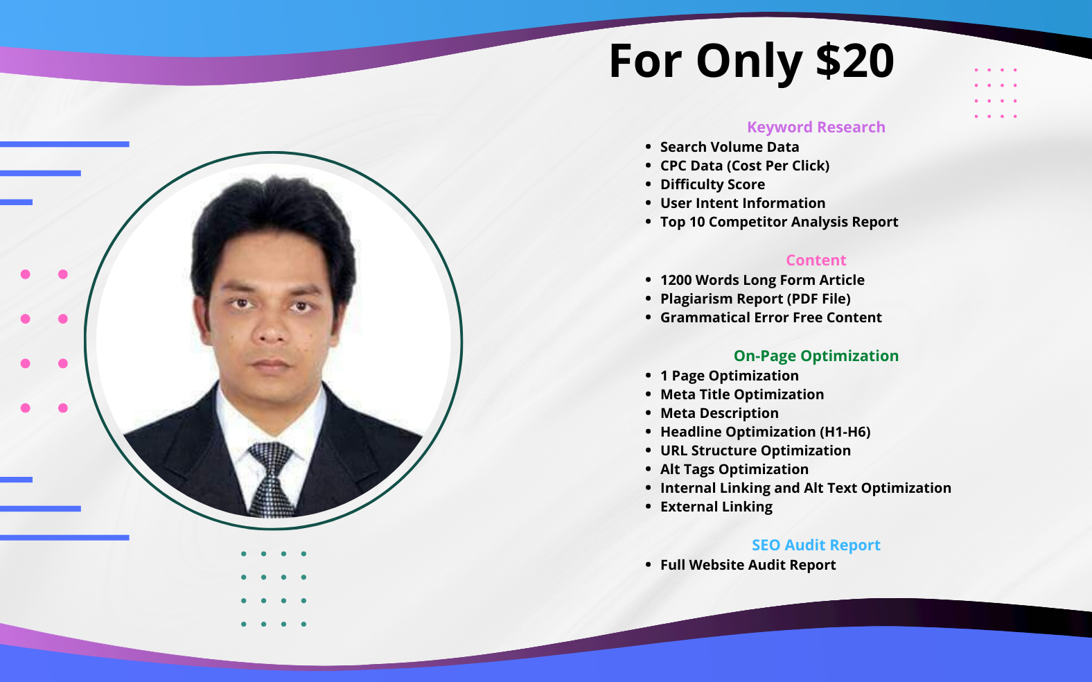 You will get one well-researched keyword with a competitor analysis report that best fits your niche. With the keyword, you will get: