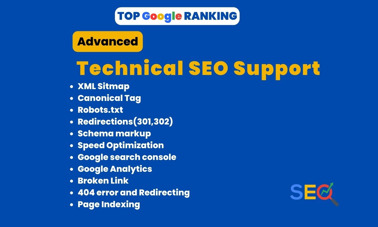 About this GigAre you struggling to rank your website higher in search engine results pages? Do you want to improve your technical site SEO performance and increase your organic traffic? Look no further!As a technical expert, I offer a comprehensive Fiverr gig that will help you identify and fix technical issues that are holding your website back. My gig includes a detailed audit of your website, covering areas such as page speed, mobile-friendliness, site architecture, and more. I will provide you with a comprehensive report and actionable recommendations to help you optimize your website and boost your search engine rankings.Let me help you take your site to the next level with my technical SEO services. Details of Services: 1.XmL sitemap2.Robots.txt3. Canonical Tags4.Redirections(301,302)5. Schema markup6.404 error/Redirection7. page indexing8. Speed Optimization9. Google search console 10. Google Analytics11. HTTPS setup12. Broken Link