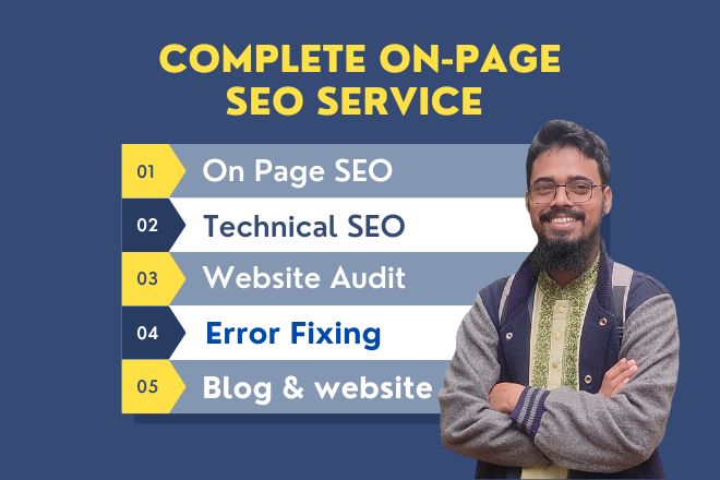 I will perform On-Page SEO Optimization services for your WordPress, Shopify, Wix, Squarespace, Blogger, or Webflow website and give you a detailed report. Additionally, I will ensure that my on-page SEO strategies effectively enhance your ranking results.Note: If you are using WordPress, I can perform on-page optimization using Rank Math and the Yoast.On-Page SEO