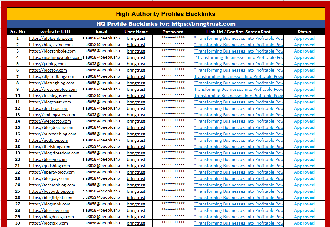 A: Definitely! After completing the successful submission of Backlink, I'll provide an Excel/Google sheet report where all the relevant proof is shown. Customer satisfaction is our 1st priority.