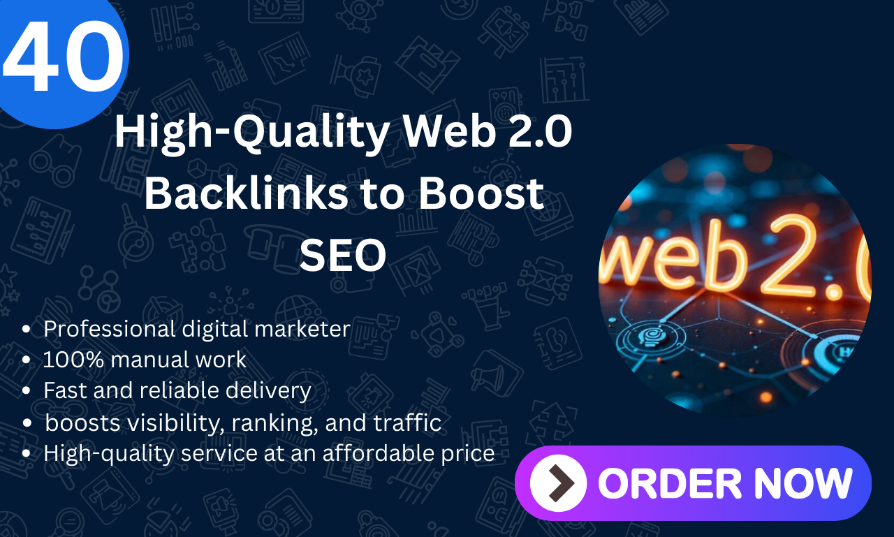 You're in the right place!I will create 40 High-Quality Web 2.0 Backlinks using manual, SEO-friendly methods to help your site gain trust, authority, and long-term ranking power.What You Will Get: