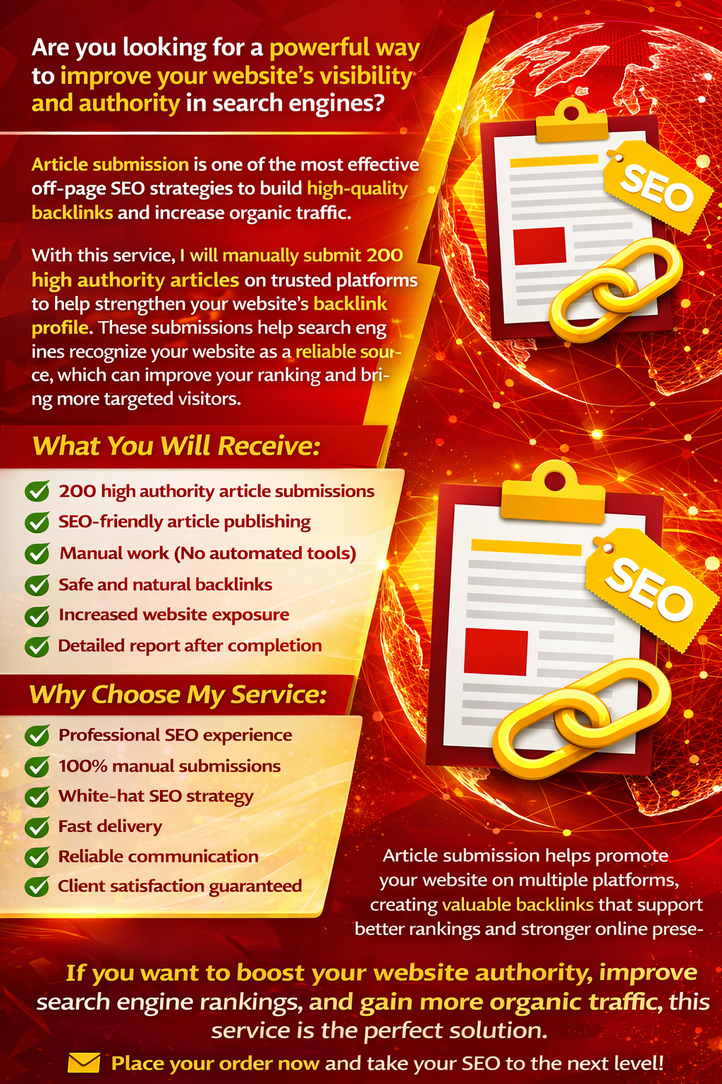 1. Are the article submissions done manually? Yes, all article submissions are 100% manual to ensure quality, accuracy, and safe SEO practices. 2. What type of websites will you use for submissions? I use trusted article directories and high-authority platforms that help create strong and natural backlinks. 3. Do you use white-hat SEO techniques? Yes, all submissions follow white-hat SEO methods that are safe and suitable for long-term ranking improvement. 4. Will these backlinks help improve my Google ranking? Article submission backlinks help increase your website authority and can support better rankings and organic traffic. 5. Do I need to provide the articles? You can provide your own articles, or I can also help create SEO-friendly articles if needed. 6. How many backlinks will I receive? You will receive up to 200 article submission backlinks depending on the package and platform approval. 7. Will I get a report after completion? Yes, you will receive a complete report with submission links after the work is finished. 8. Is this service suitable for all websites? Yes, this service works for most websites including business, blog, affiliate, and eCommerce websites. 9. How long does the work take to complete? Delivery time depends on the order size, but usually the work is completed within a few days. 10. Are the backlinks permanent? Most submissions are permanent, but it also depends on the policies of each article platform. ORDER NOW