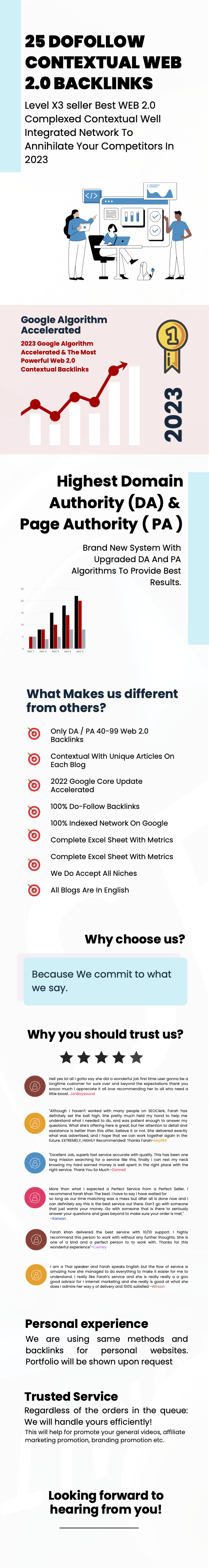 I am using same methods and backlinks for my own websites and I am ready to show you portfolio upon requestTrusted Service