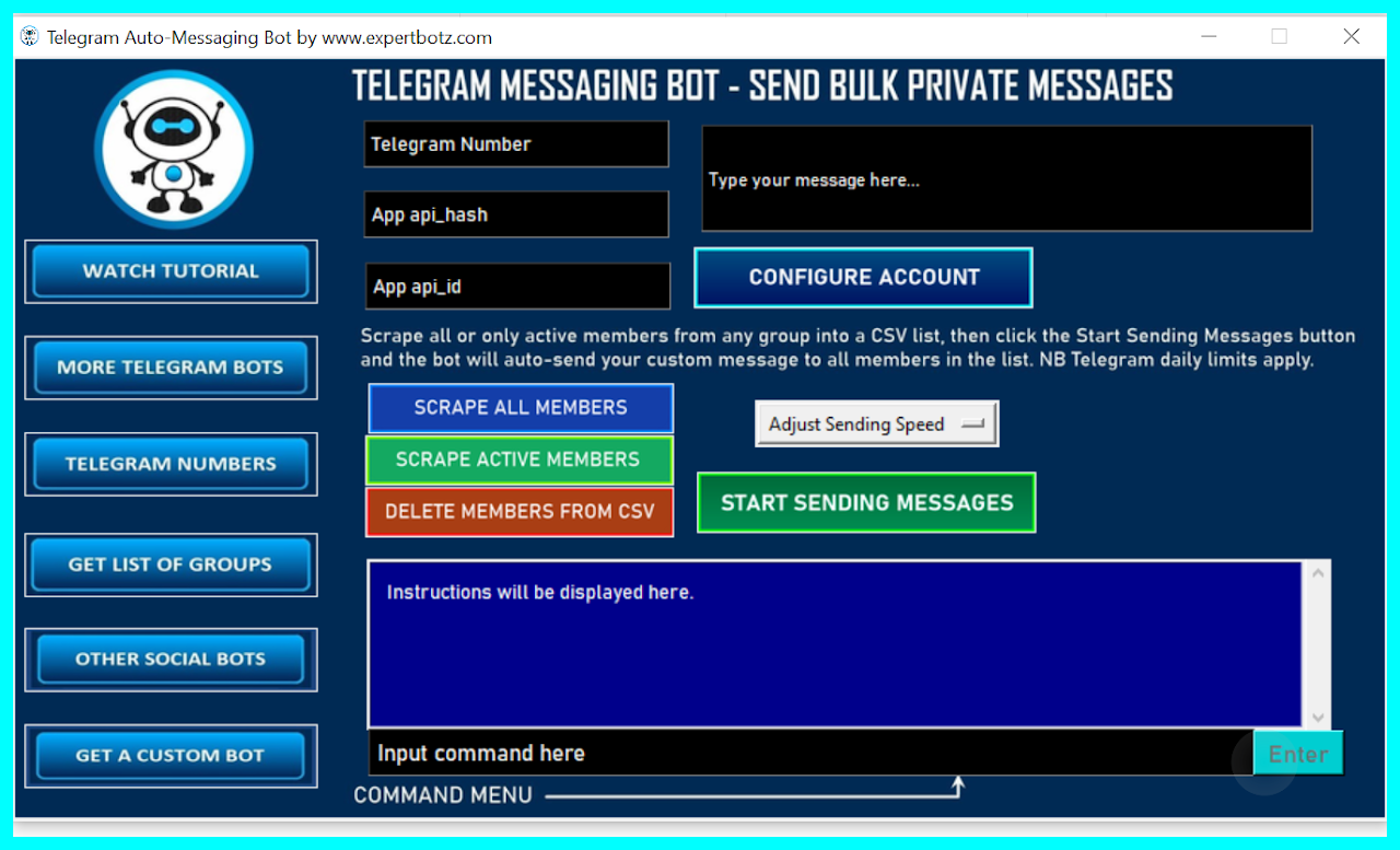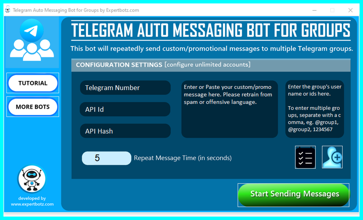This bot will automatically send custom messages to multiple Telegram groups. It also allows you to set a custom loop time for messages to be repeated so your messages can be rotated periodically. Configure unlimited accounts and send messages to unlimited groups per day. Click here to read more details of this software.
