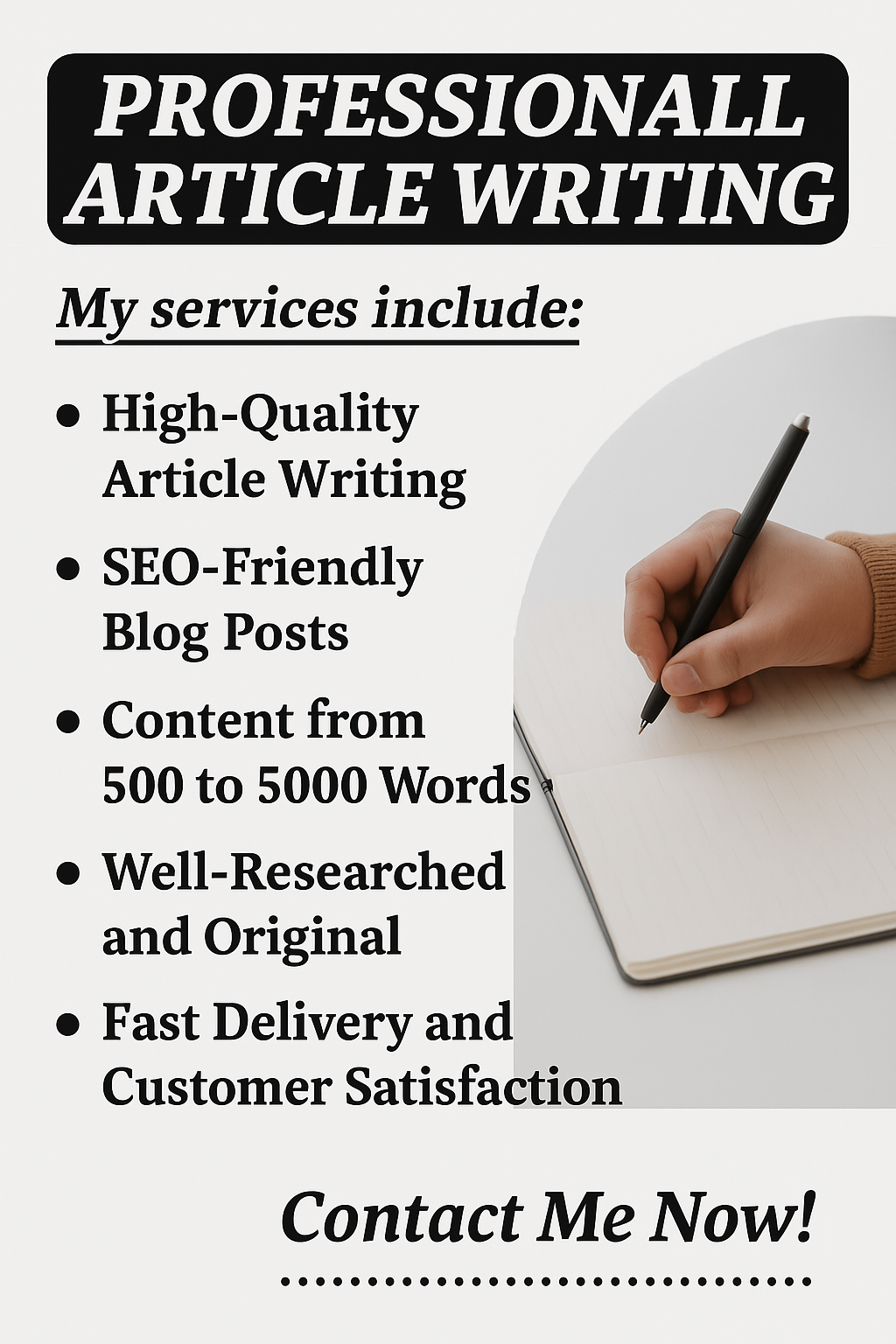 You’re in the right place!I specialize in creating well-researched, SEO-friendly content, perfectly tailored to your needs. Whether you need a short article of 500 characters or an in-depth post of up to 5000 characters, I deliver content that captures attention and grows your audience.✨ What I offer: