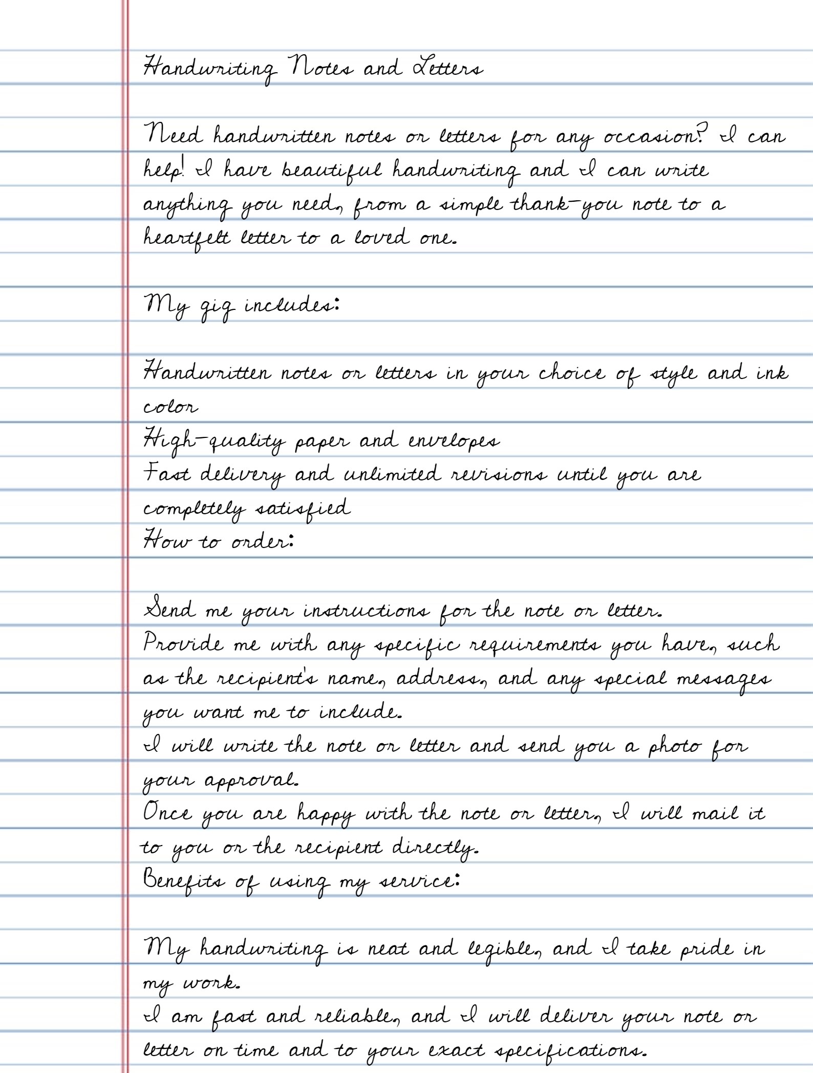 Need handwritten notes or letters for any occasion? I can help! I have beautiful handwriting and I can write anything you need, from a simple thank-you note to a heartfelt letter to a loved one.