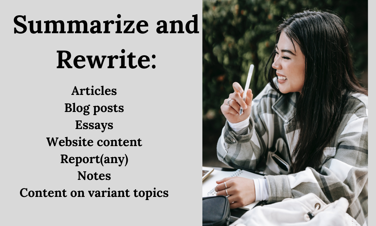 Hello, Are you looking for writing, rewriting, or summarizing services? You're at the right gig. This gig is for writing articles, summarizing English content, and rewriting your plagiarized content.--------------------------------------------------------------------------------------------I will write, summarize and rewrite: