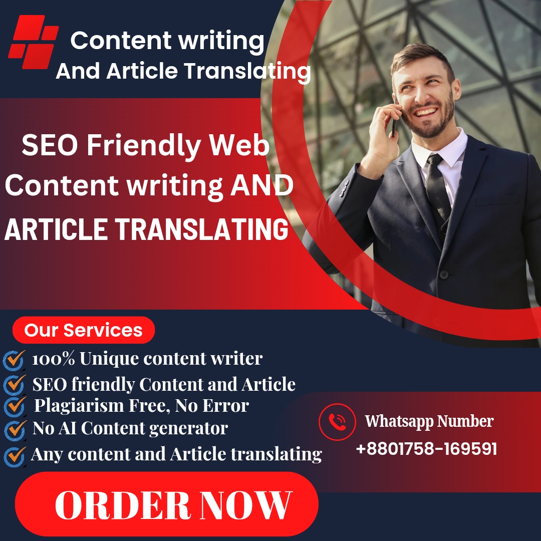 Gig Description:Are you looking for high-quality, engaging, and SEO-optimized content for your website or blog? Look no further! I will craft a unique 1000-word article tailored to your specific needs and topics. What You Get:Original Content: 100% unique and plagiarism-free articles.SEO Optimized: Articles that are optimized for search engines to improve your website's visibility.Engaging Writing: Content that captures your audience's attention and keeps them coming back for more.Custom Topics: You choose the topic, and I'll do the rest. Perfect for any niche or industry.Timely Delivery: Fast turnaround without compromising on quality.Why Choose Me?Experienced Writer: Years of experience in writing for various niches.SEO Expertise: In-depth knowledge of SEO best practices to help your content rank higher.Quality Assurance: Thorough research and careful editing to ensure top-notch quality.How It Works: 1. Place Your Order: Choose the package that best fits your needs.2. Provide Details: Let me know your topic, any specific keywords, and other requirements.3. Receive Your Article: Get a well-written, SEO-friendly article delivered to you on time.Our Service :1. 100% unique content writing .2. SEO Friendly Web Content and Article Writing .3. Any Web Content and Article Content translating .4. Plagiarism Free , No Error .5. No AI Content Generator .I'll write on the following subjects, among others, that you request: Write excellent blog entries and SEO web content to increase your internet visibility. Don't pass up this opportunity. Please send me queries through messaging. I am writing for 100% unique content.Before placing a press release or any copywriting-related order. PLEASE CONTACT ME.Gmail: [email protected]: +8801758-16951