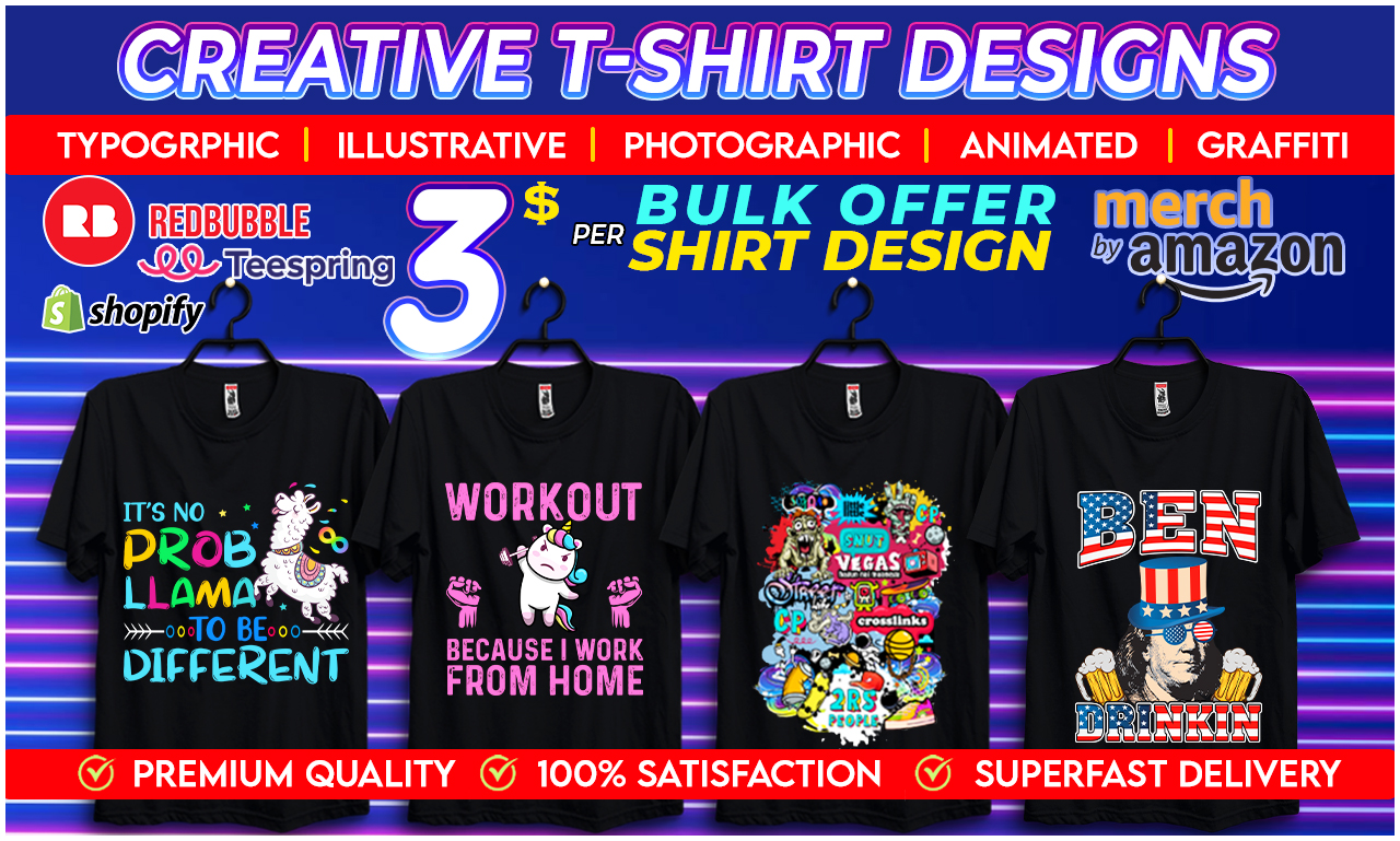 I will do trendy, illustrative and typographic bulk t shirt designs superfast