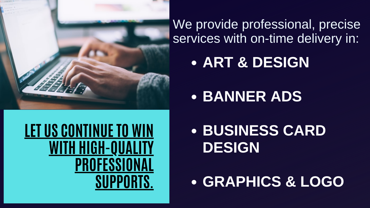 We support you in art & design, banner ads, business card design, and graphics & logo designs