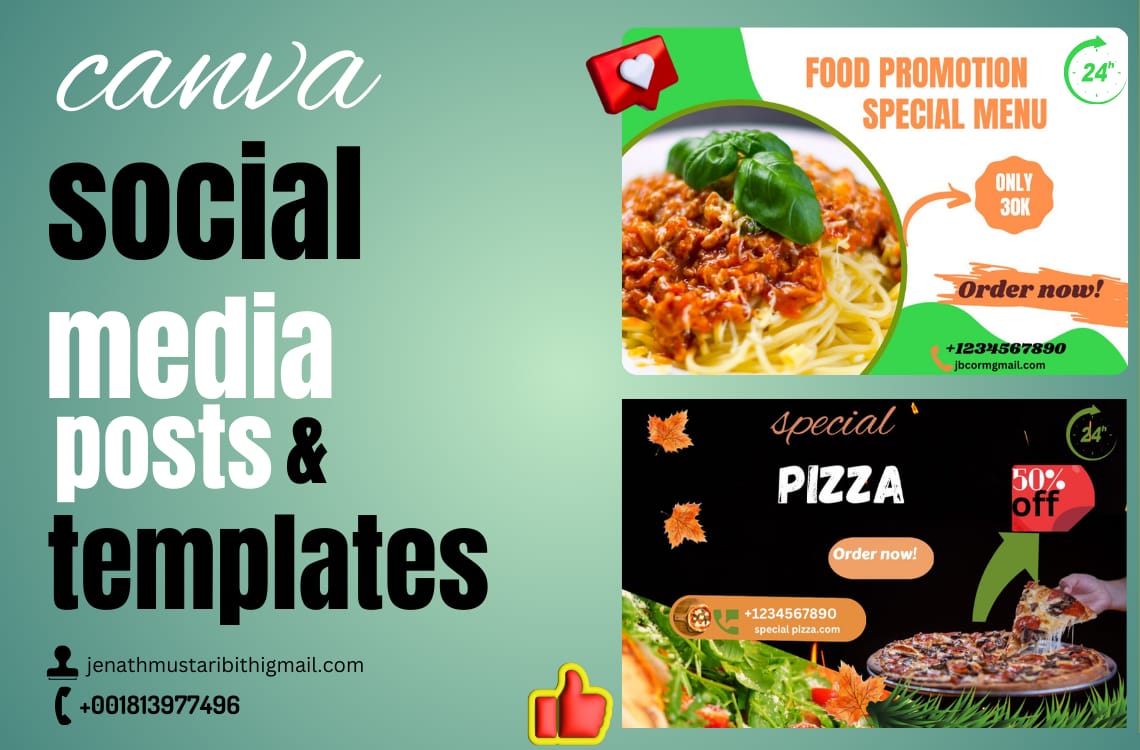About this gigHey!This is Jenathmustari . I will design your social media post template , banners , ads in Canva offering monthly solutions to you for making designs for all kind of social media platforms for all types of businesses .I will design anything using Canva, which will be editable. If you are blogger/social media influencer , then it will help you to create multiple posts with the same design without knowing any graphic skill.I'm Expert In :-