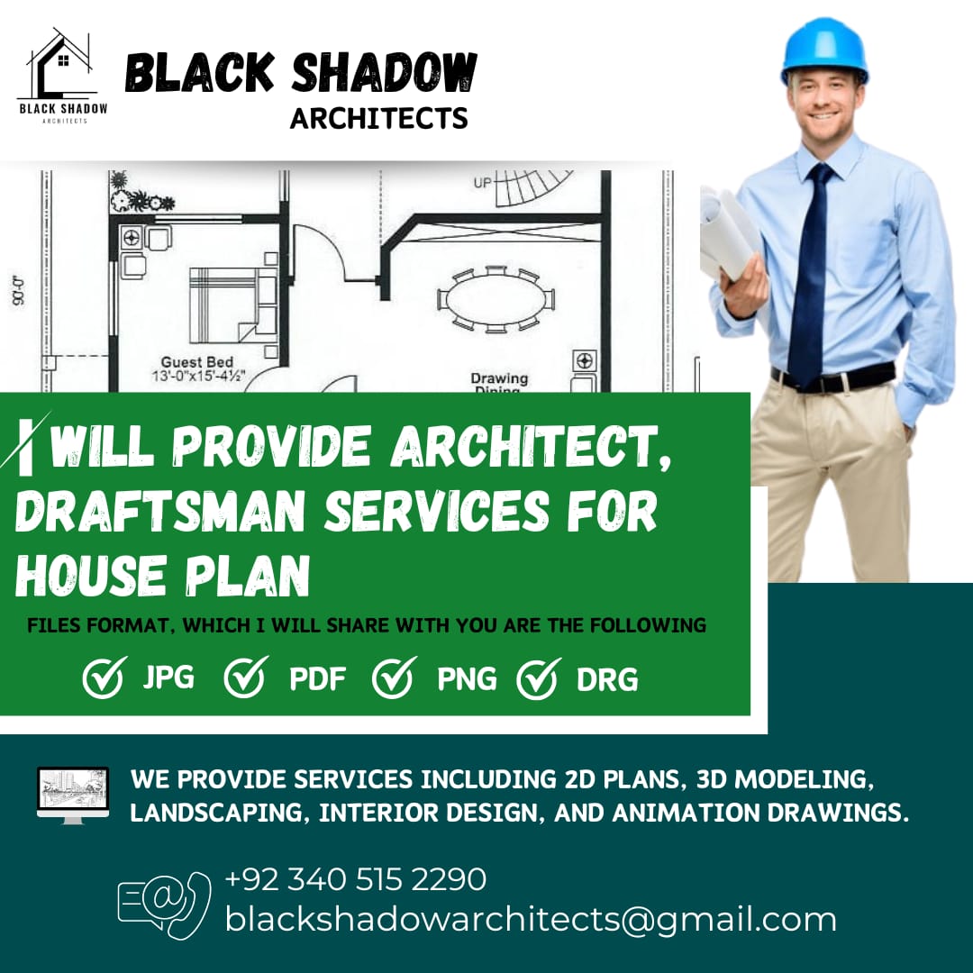 GreetingsIf you are looking for Architect, Draftsman service for House Plan Architecture. you are at the right place. I am an Architect with experience in Residential Architecture.I'll provide you:2D floor plan with little details.2D floor plan with high details2D or 3D floor plan with advanced detailsFile formats that I will give are the following:JPGPDFPNGDWG Kindly message me before placing the order Regards,Black Shadow Architects