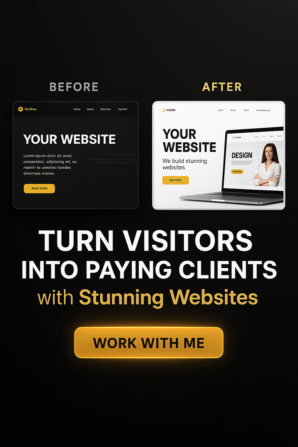 Draw attention and turn your visitors into paying clients with this ultra-realistic, sleek service ad designed exclusively for premium web design agencies. Featuring a modern and clean layout with bold typography, this ad powerfully showcases a “Before & After” website transformation to highlight your design impact.