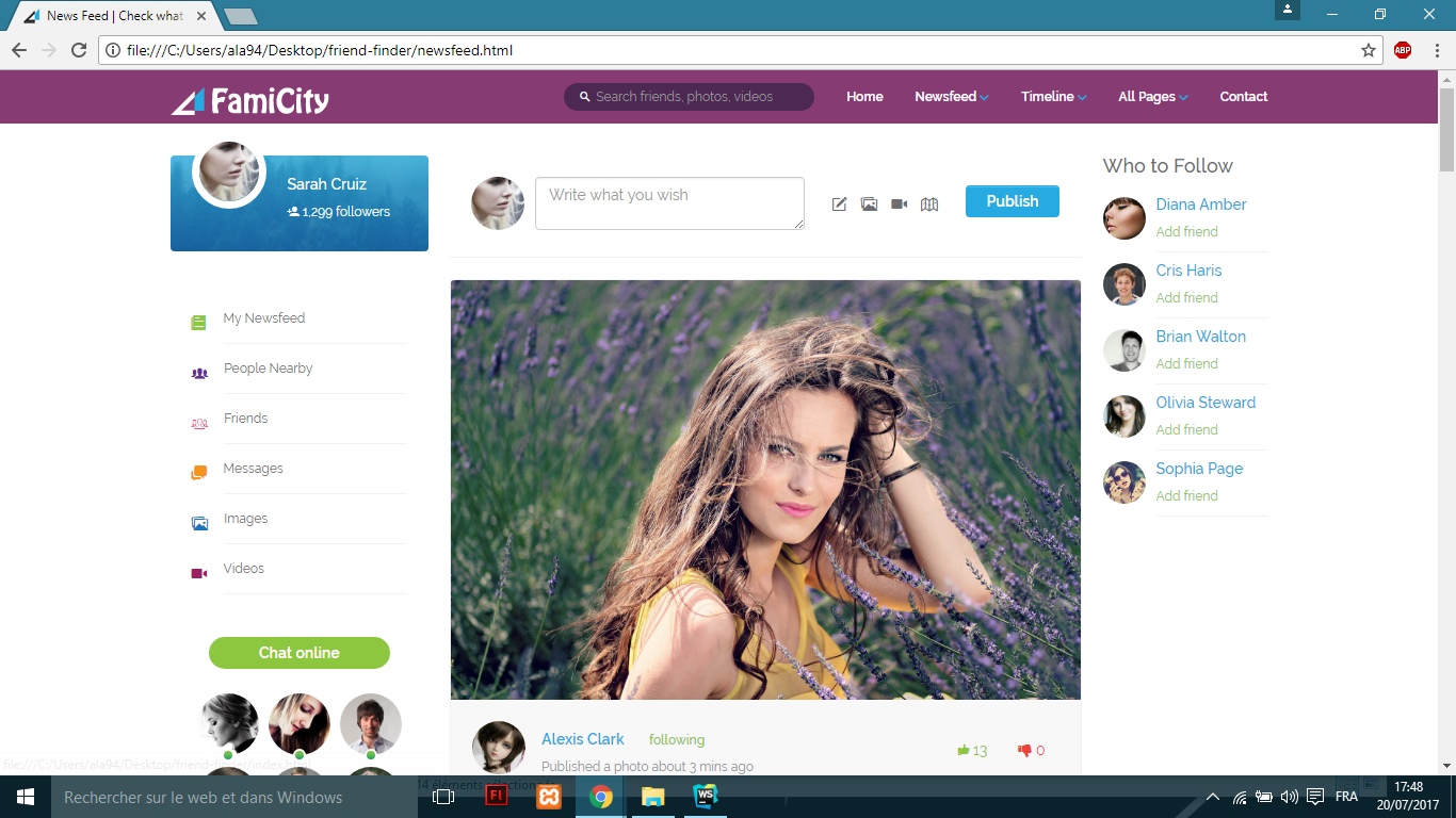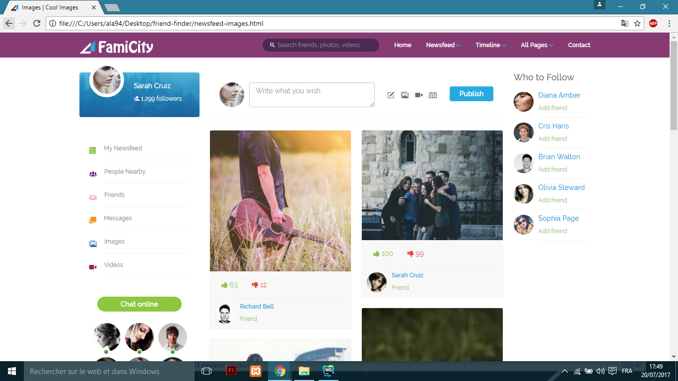 We Will create for you a responsive template for a social media which mean you will get a 3 vues add images screen ,add video screen and newsfeed screen where you can add (post,write statut,react to post,like,dislike,ext...), for use on phone,tablet or screen it can fit every where ![]()