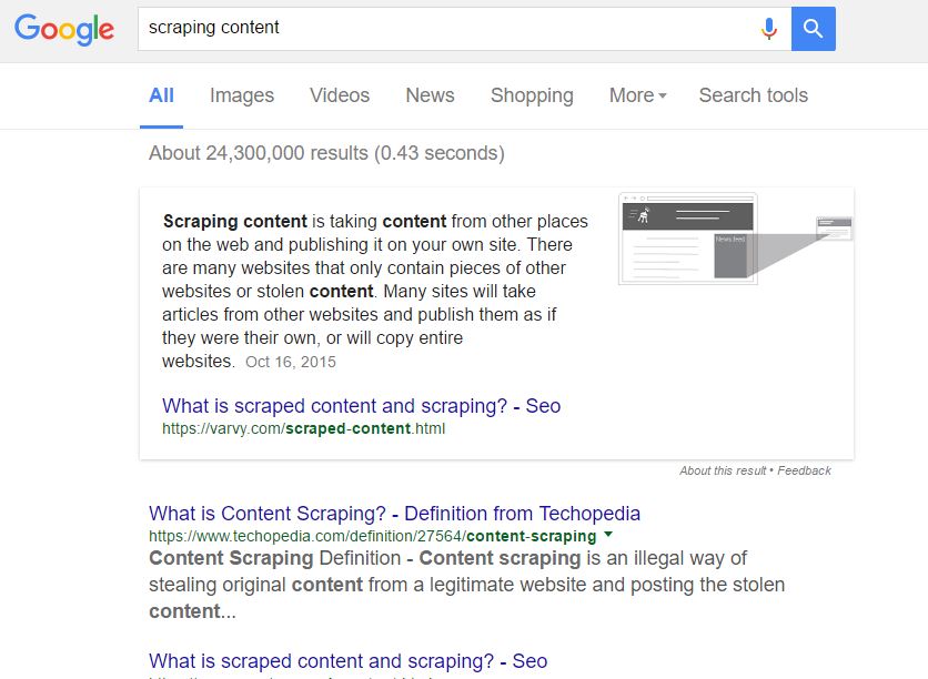 For example: "scraping content" - sure that provided answer will satisfy most people but the vast majority of users that really want to learn more on this subject will actually click the box and ignore another organic search result, making the owner of the website pretty happy.