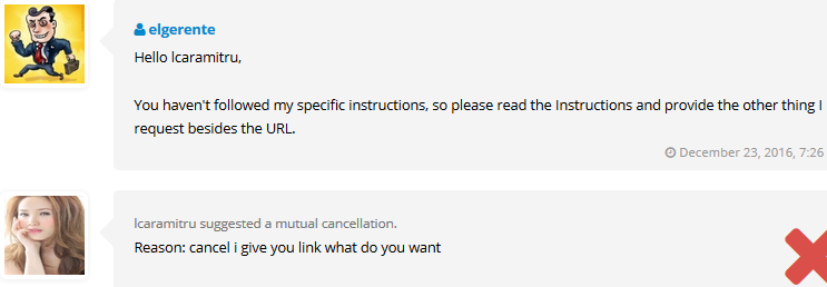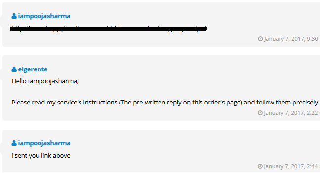 I contacted the Staff about finding a technical way to force the clients to read the very short and simple Instructions... (a much simple version of them is written at the top of the service's page as well, just to let them know that providing URL is not enough)... but they simply pointed the obvious, which is - you can't force anyone to read anything. If I can't force someone to read the 1st or 2nd sentence in the Description, then in the name of doing business, something needs to be done. Thus, I couldn't possibly be the only one with such an issue.