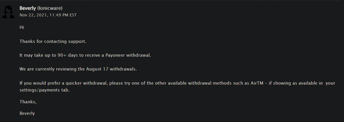 Payoneer withdrawal should not be like this ( 60+ days) facing the same problem! Payoneer withdrawal should not be like this ( 60+ days)