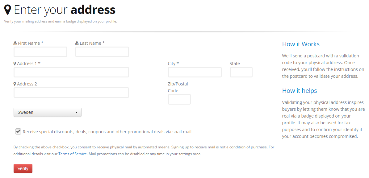Enter your details. First name, Last name, Address, City, State, Zip/Postal Code and chose your country within the list. When you've done this, press "Verify" and this it what happens next: