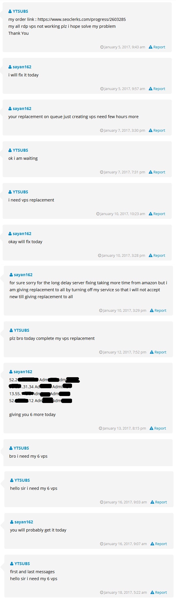 He not give me replacement all vps are down I already sent message not respond me just said wait will be paid enough he is not a trusted man