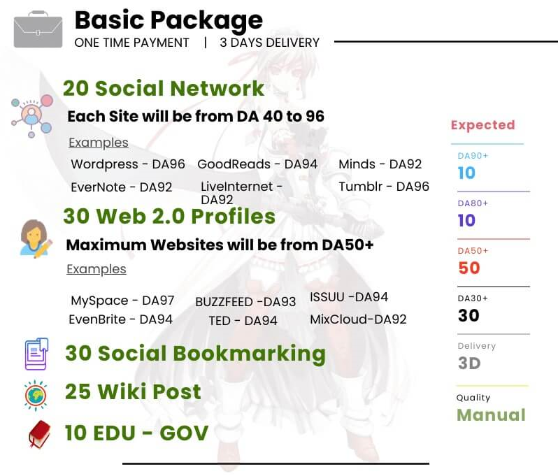 We provide best service or 100% refund! Check our next gigs. - 20 Social Newwork (DA 40 - 96) - 30 Web 2.0 Profiles (DA50+) - 30 Social Bookmarking - 25 WIKI Post - 10 EDU - GOV MANUAL WORK