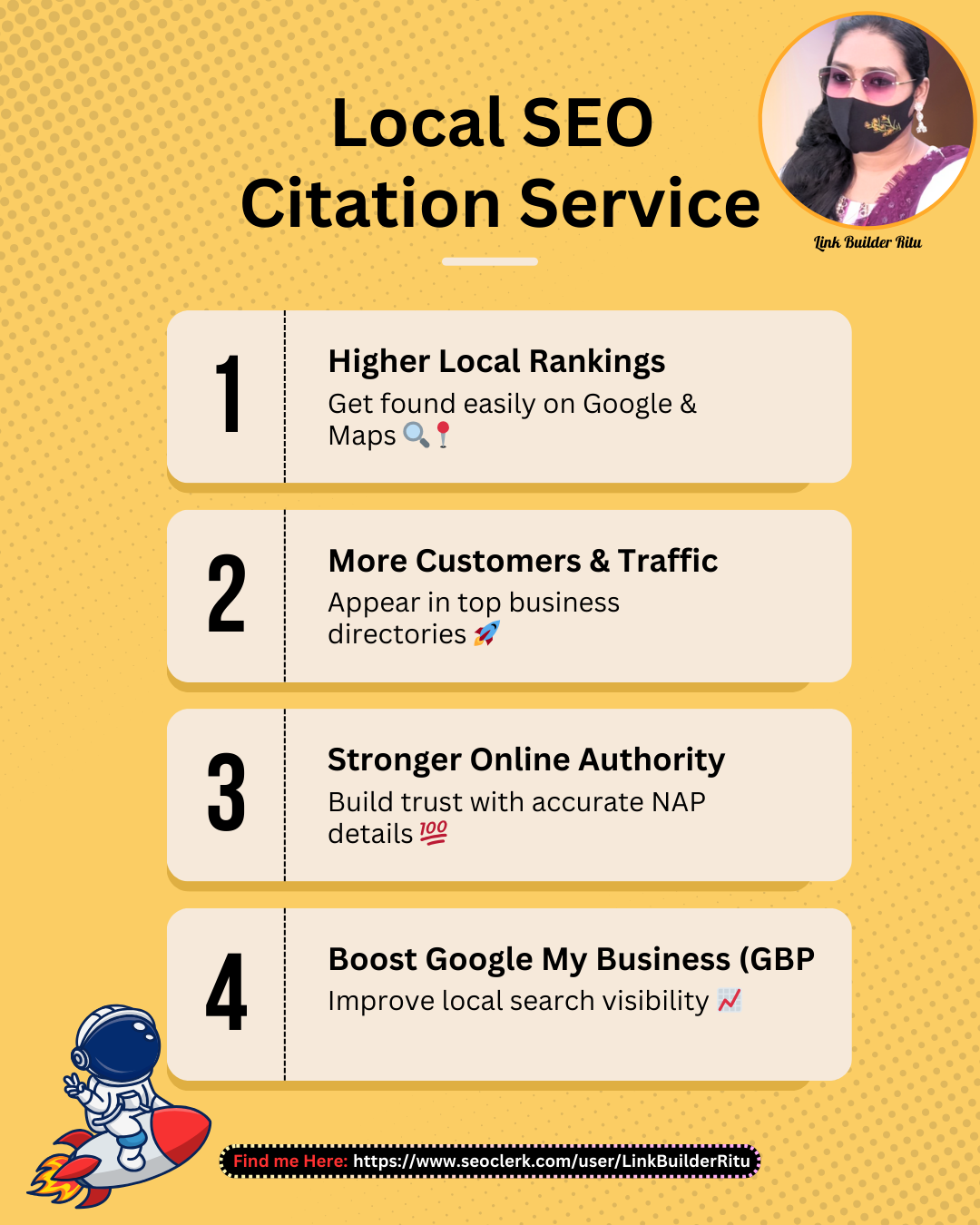 I will manually create high-quality local citations to improve your Google Business Profile (GBP) and increase your local SEO rankings. Get listed in the best business directories and make your business visible to potential customers in your area!
