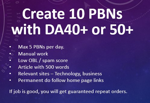 Create 10 PBNs with DA40 or 50 Max 5 PBNs per day. Manual work Low OBL spam...