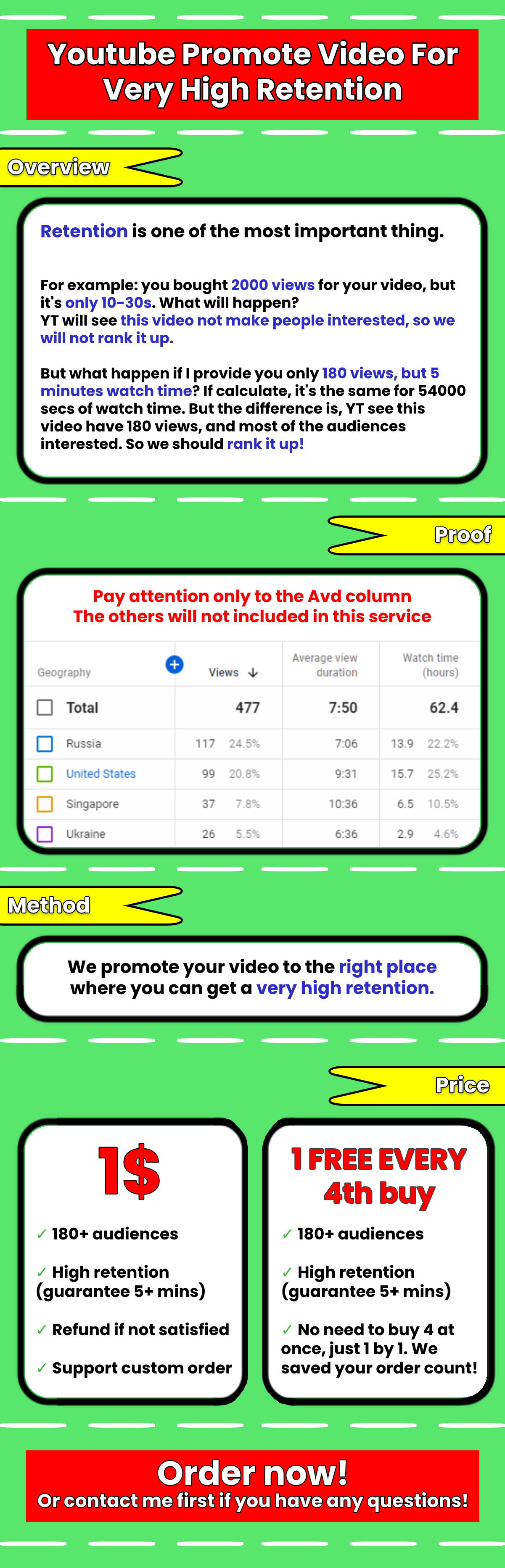 I provide high retention views with external traffic (Facebook, Twitter, Instagram, Okru).
